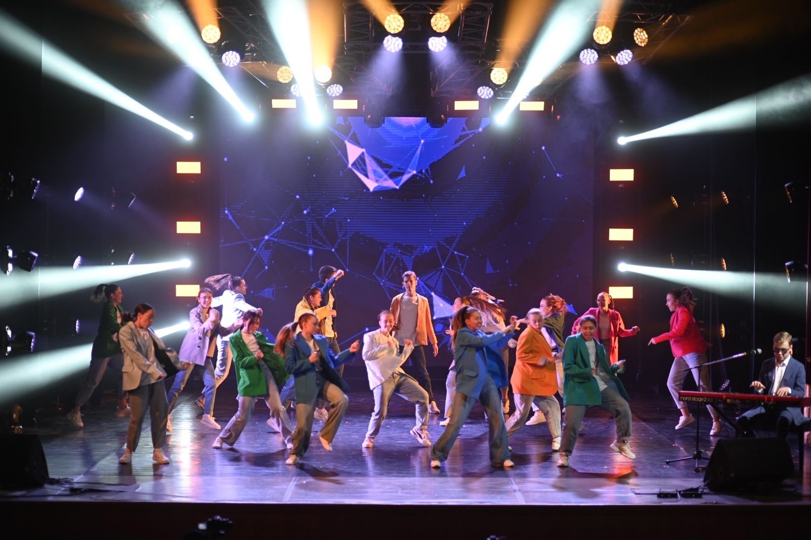 Игра Олега Аккуратова на синтезаторе сопровождает и последующие номера. Наставниками зажигательных танцевальных постановок стали хореографы Виталий Савченко, Марк Куклин и Александр Могилев. Они же выступают с ребятами вместе на сцене. За кулисами тоже никто не может удержаться от драйва и энергии танцоров: волонтеры и участники пустились в пляс.