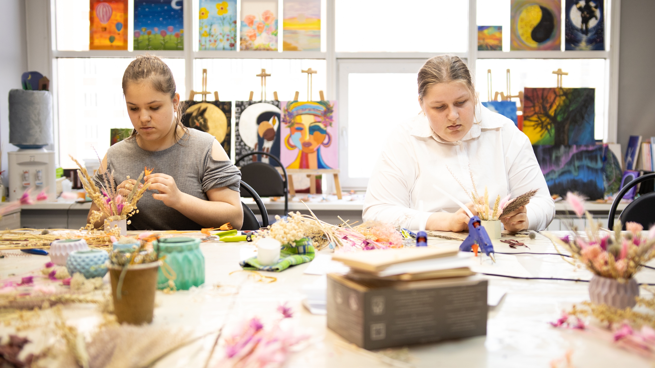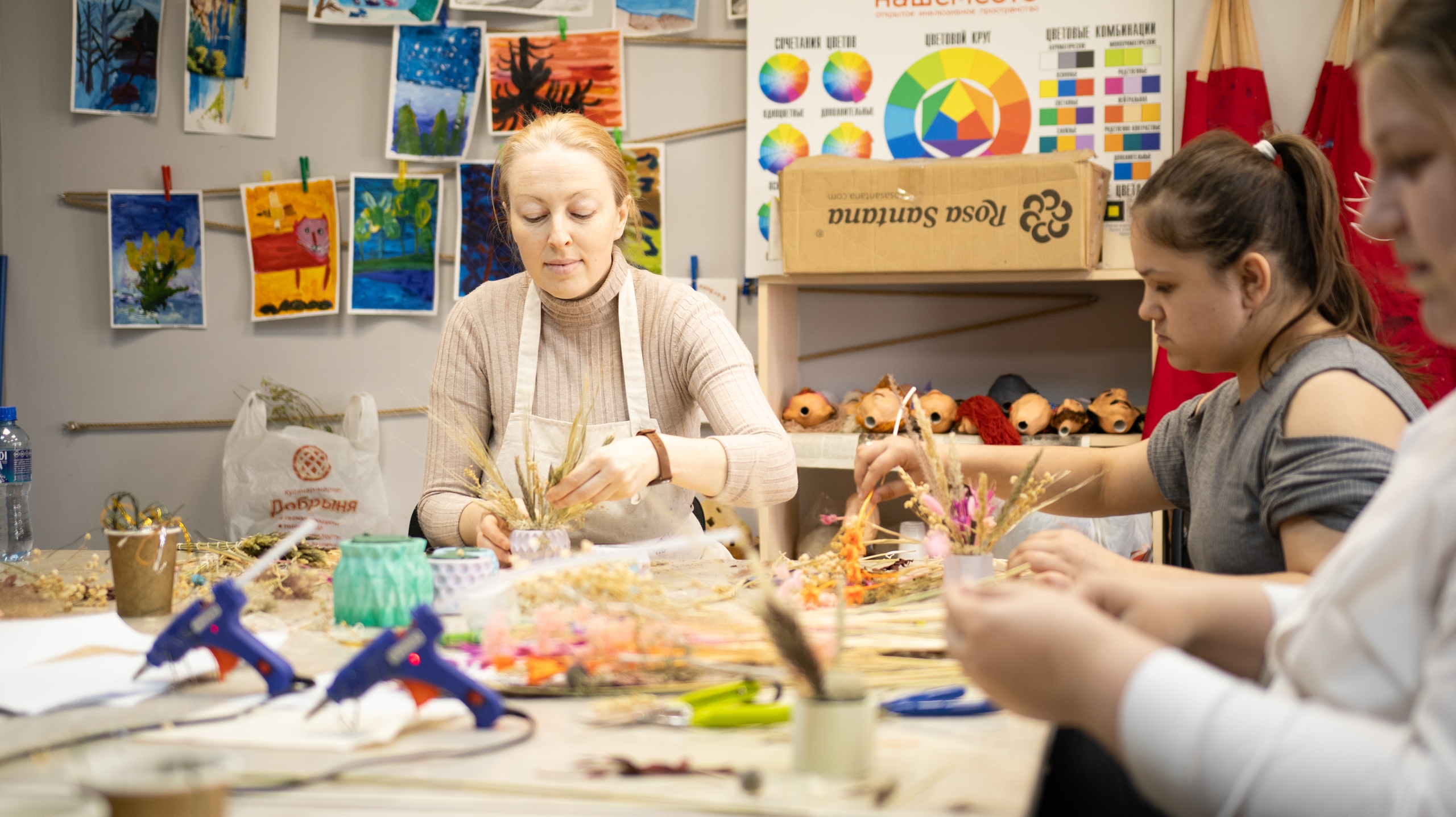 На столах — разные сухоцветы, проволочки, специальные губки для букетов и декоративные элементы. Участники создают венки, панно, открытки и ароматические свечи, учатся работать с композицией и цветом.