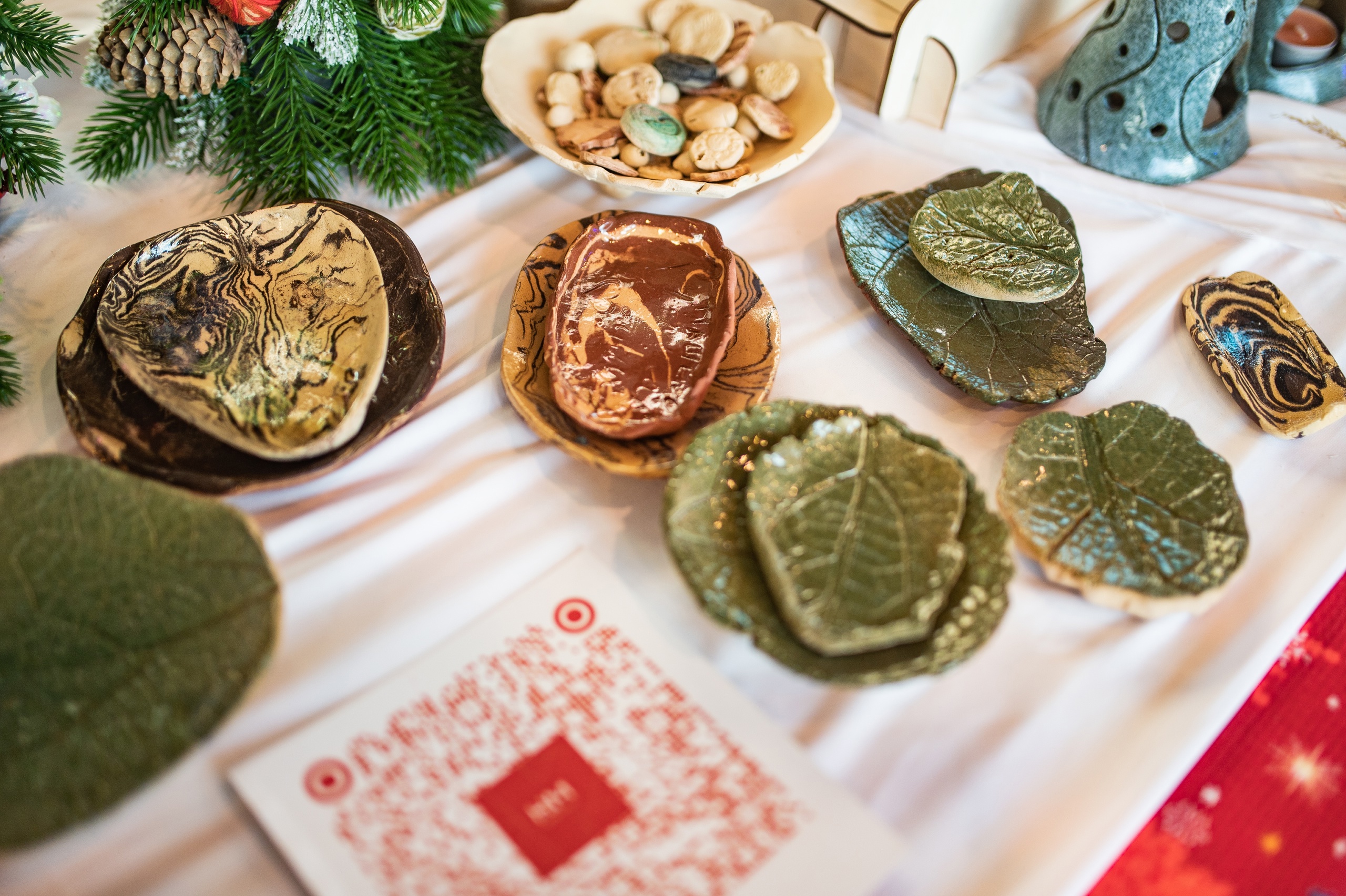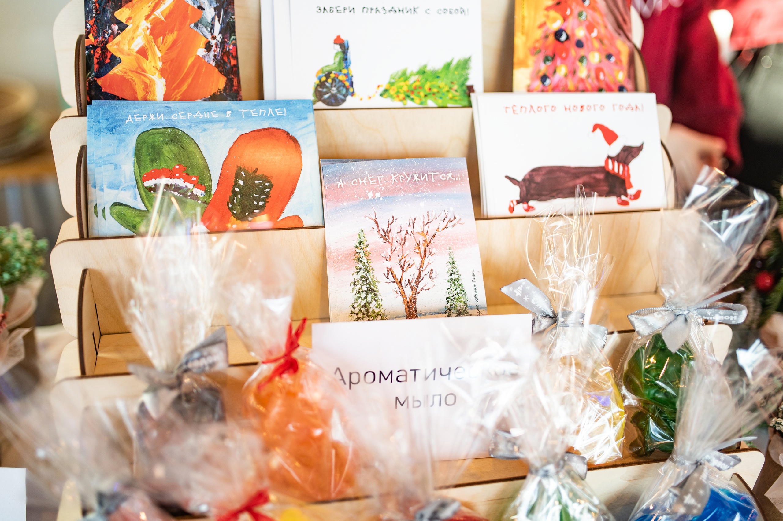 С 8 по 10 декабря гостей «Необыкновенных ёлок» радовала выставка-ярмарка изделий, изготовленных участниками пространства «ПРО|ТЕБЯ». Новогодние украшения, керамические блюдца, картины, открытки с сухоцветами — это лишь часть того, что было представлено на празднике. Познакомиться с творчеством мастерских помогали волонтеры зоны, где расположились работы наших ребят.