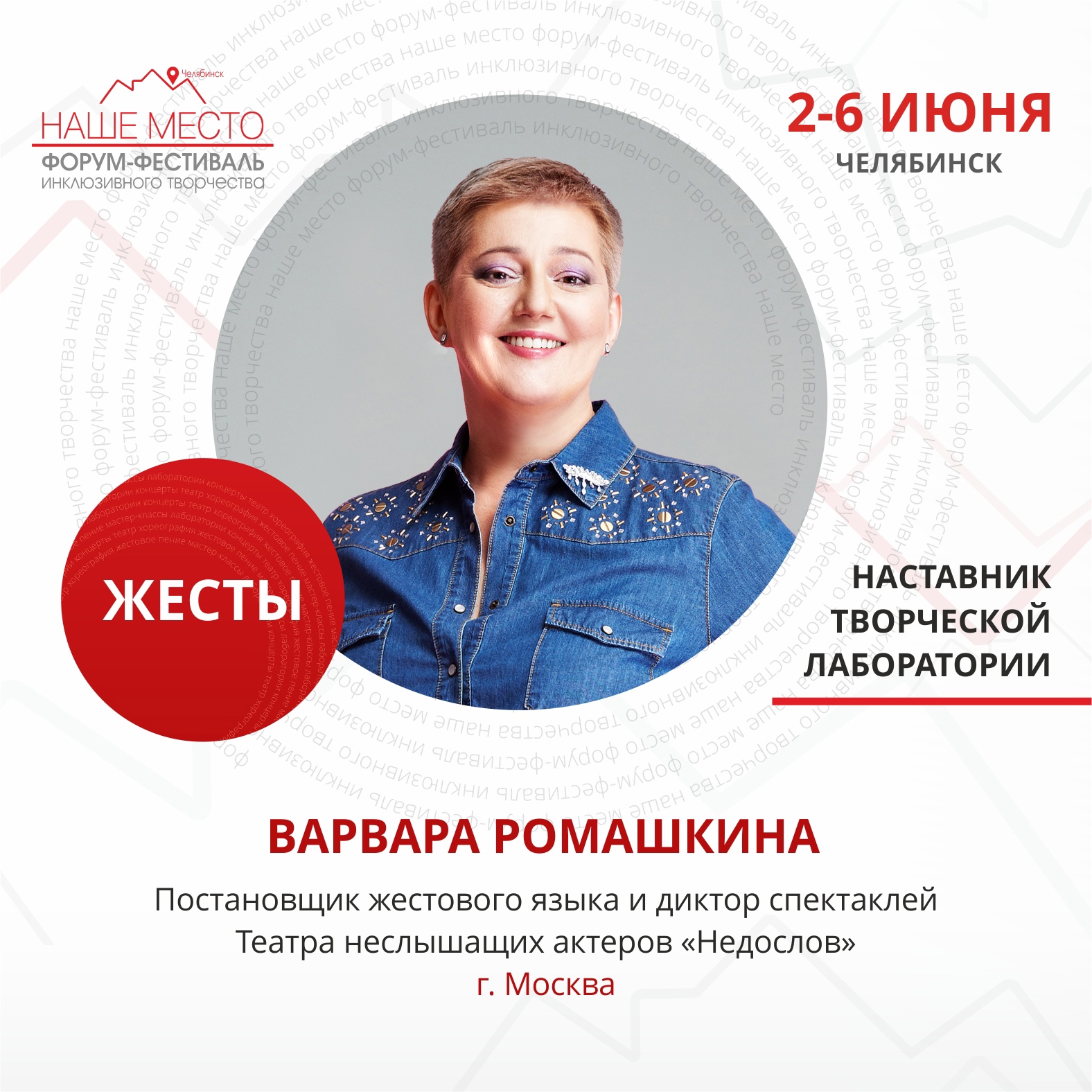 - Варвара Ромашкина! Диктор-переводчик и постановщик спектаклей театра неслышащих актеров “Недослов”, старший преподаватель кафедры сценической и жестовой речи. Участвует как постановщик жестового языка и диктор во всех дипломных спектаклях театрального факультета РГСАИ. Ежегодно проводит мастер-классы по русскому жестовому языку, принимает участие в работе жюри профессиональных конкурсов переводчиков жестового языка. Является лауреатом всероссийских и международных конкурсов переводчиков жестового языка.