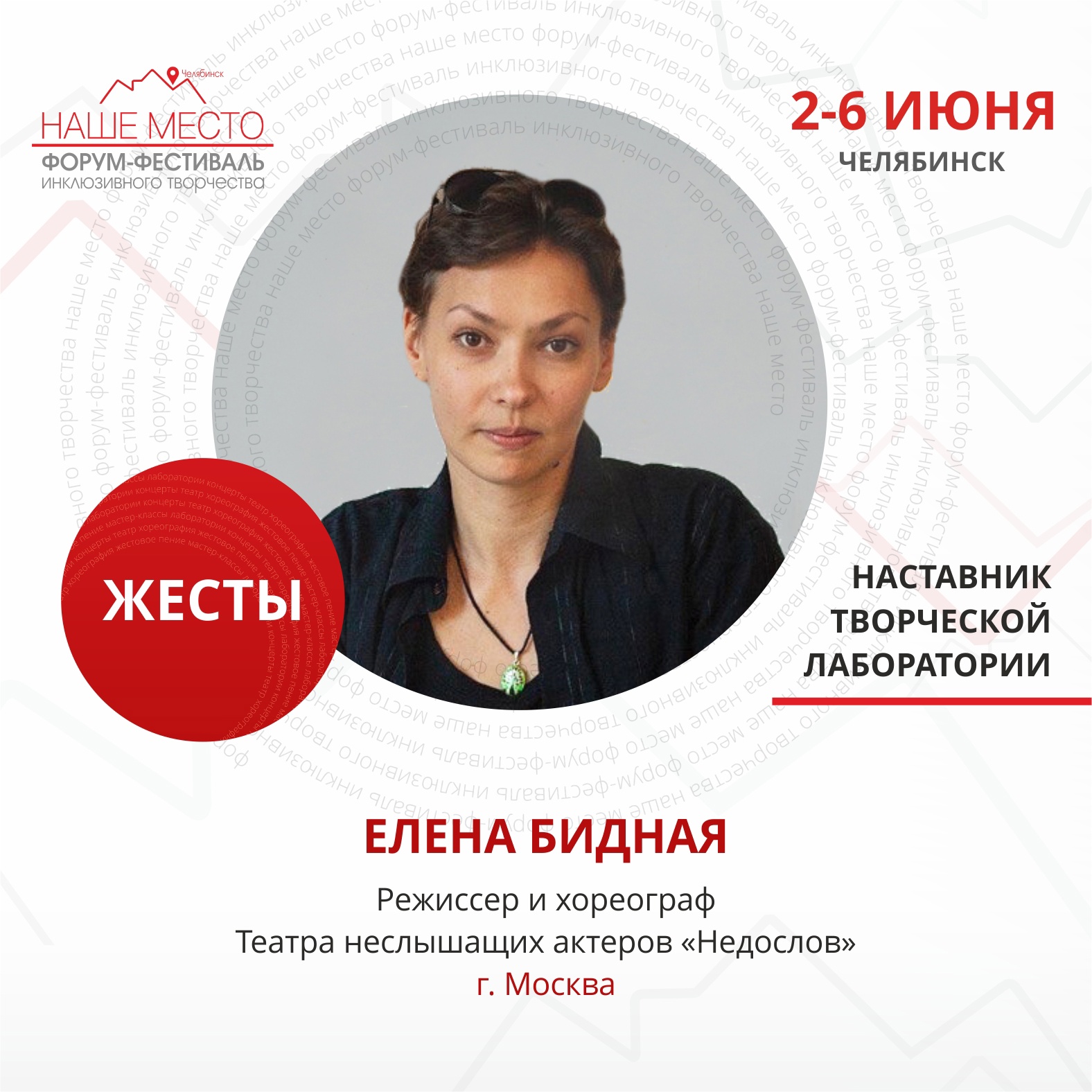 - Елена Бидная! Педагог высшей школы по пластическим дисциплинам, режиссер и хореограф театра неслышащих актеров “Недослов”, преподаватель сценического движения и актерского мастерства.